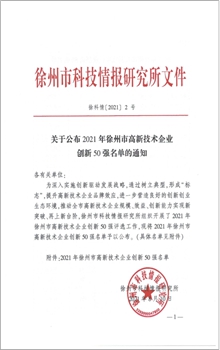 为树立典型、形成标志,提升高企品牌效应,营造良好的创新创业生态环境,发挥龙头企业的示范带头作用,徐州市科技局连续三年在全市范围内组织进行“徐州市高新技术企业创新50强”评比活动,通过对企业创新能力、创新投入、创新产出和创新绩效三个方面对企业的创新水平进行研究测算及综合评价。